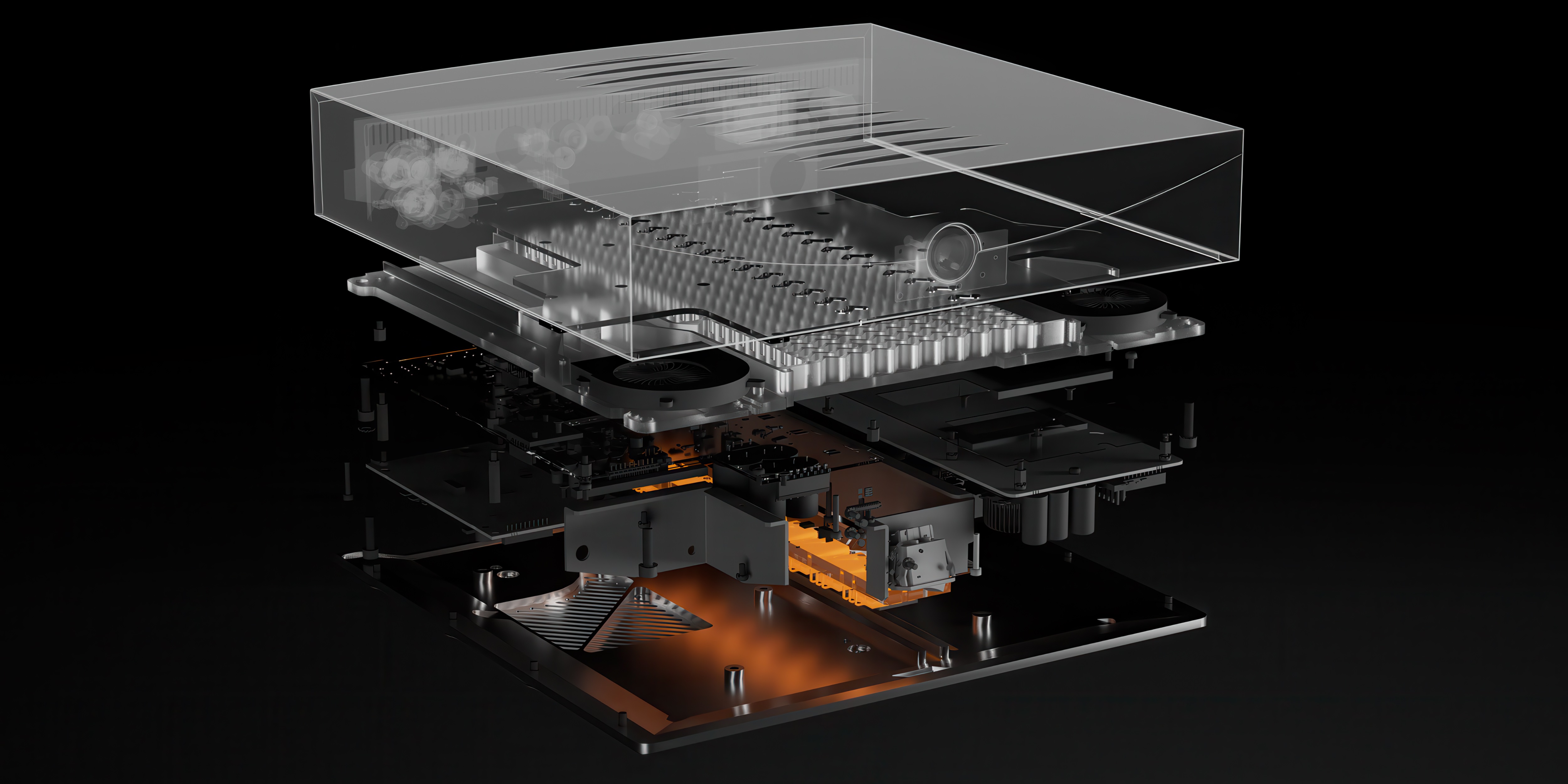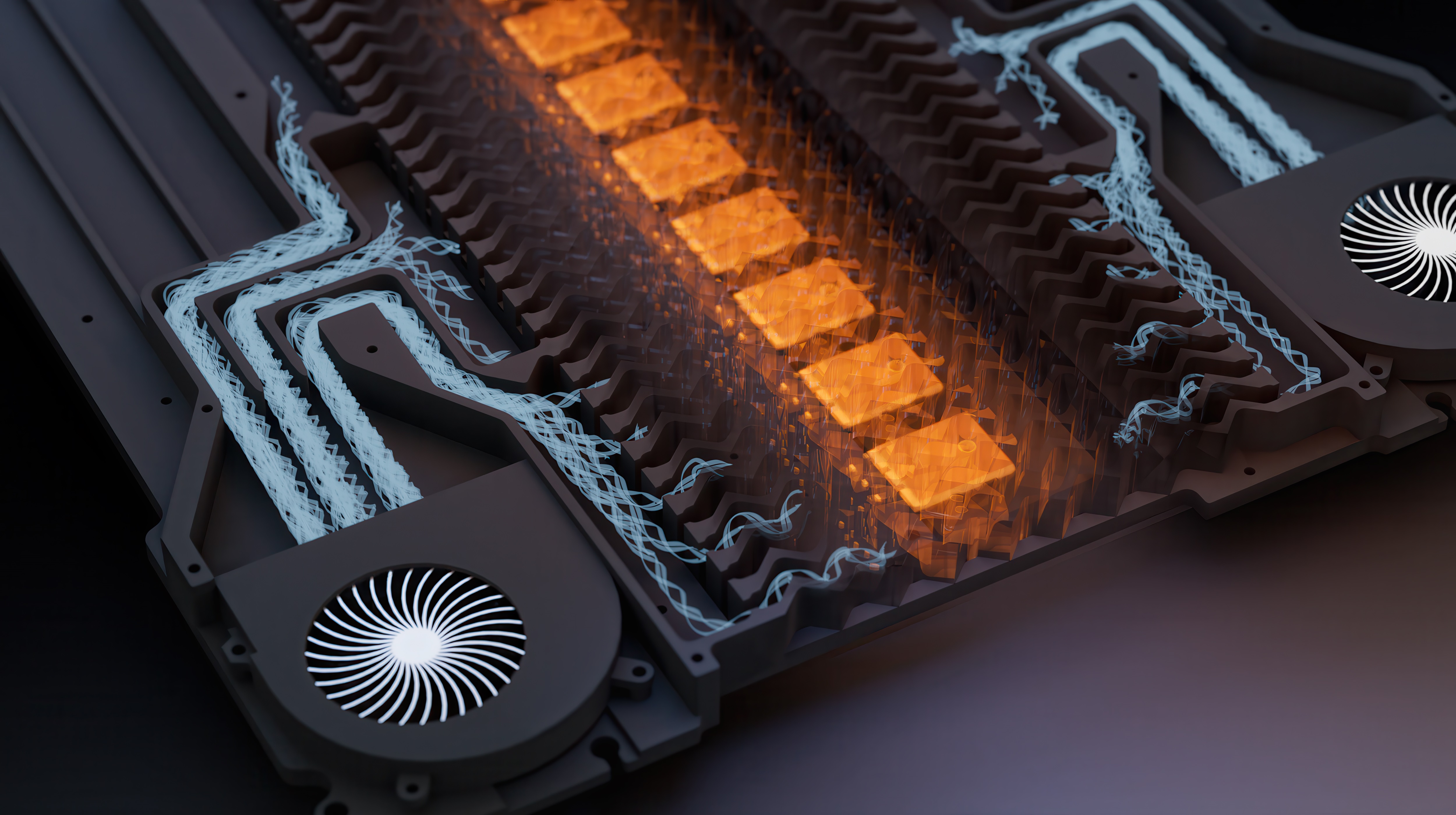 However, when the amplifier is put under heavier load, the Klimax Solo 500’s hybrid cooling matrix really gets smart. In order to safely keep the amplifier cool for optimum performance, efficiency and preservation of electrical components, the Solo 500 must now switch to active cooling using two internal fans placed deep within the product. The fans force cool air through the network of channels on top of the thermal plate, which is the hottest part of the product.