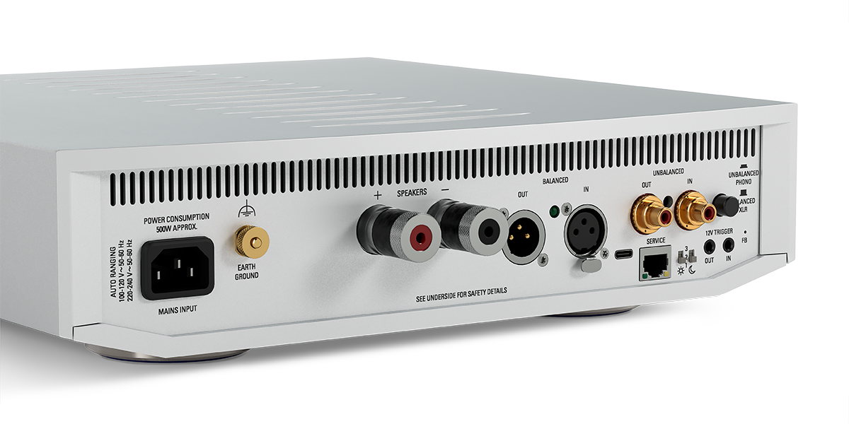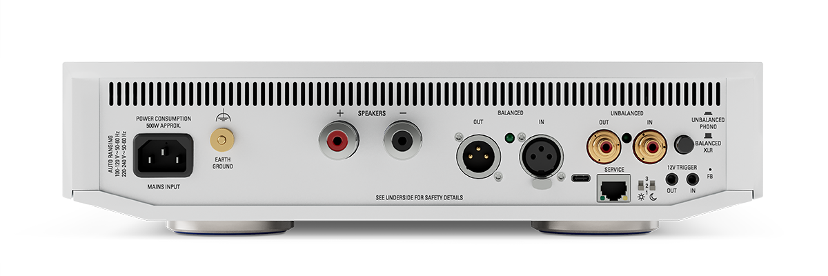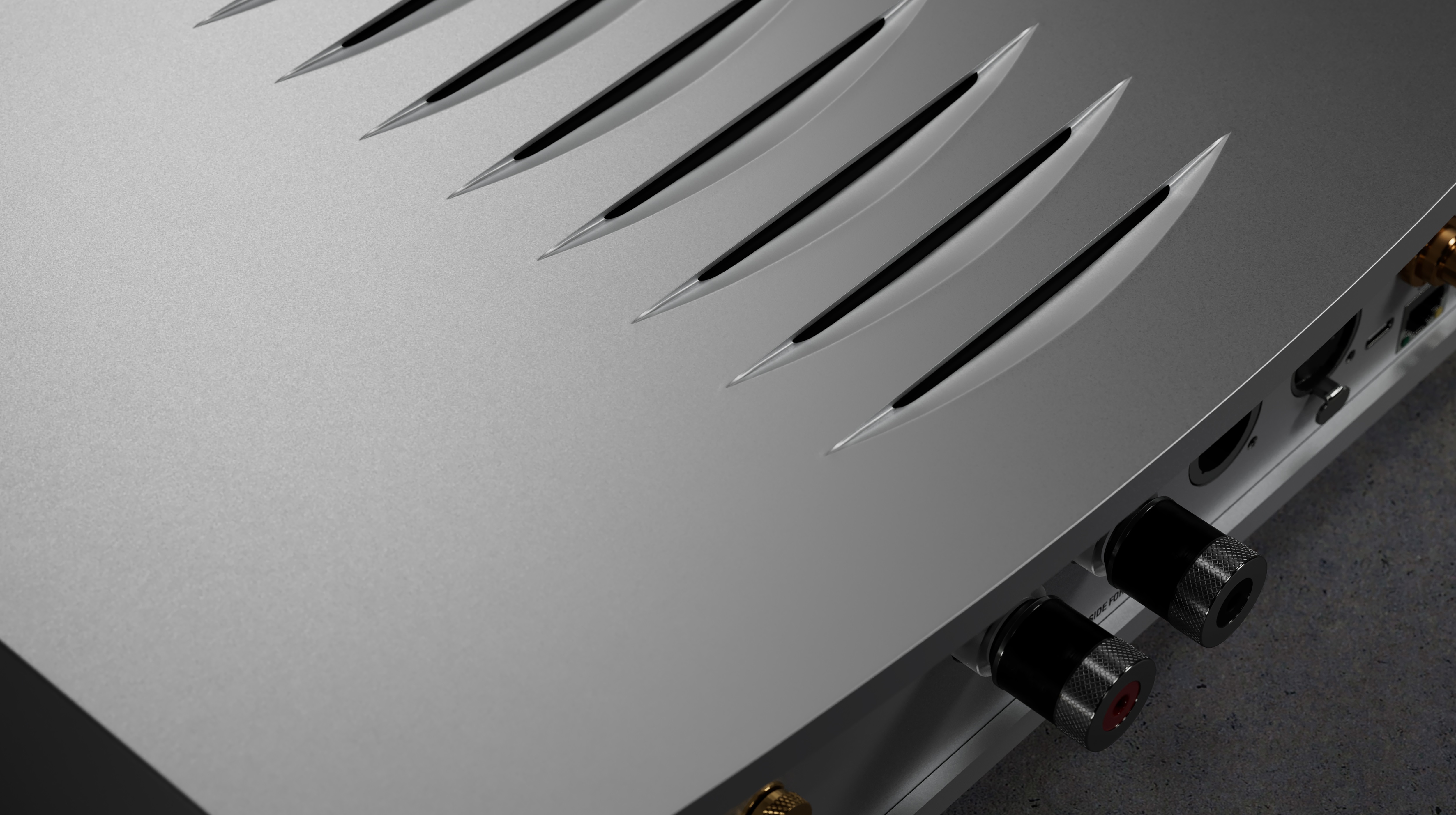 The ventilation openings on the top of the housing are equipped with fins with luminous surfaces. The cut-outs are subtle, concealed and invisible from the front. Three solid steel feet, impregnated with rubber O-rings, form an extremely stable and insulating platform for the amplifier and visually fit in perfectly with our contemporary products.