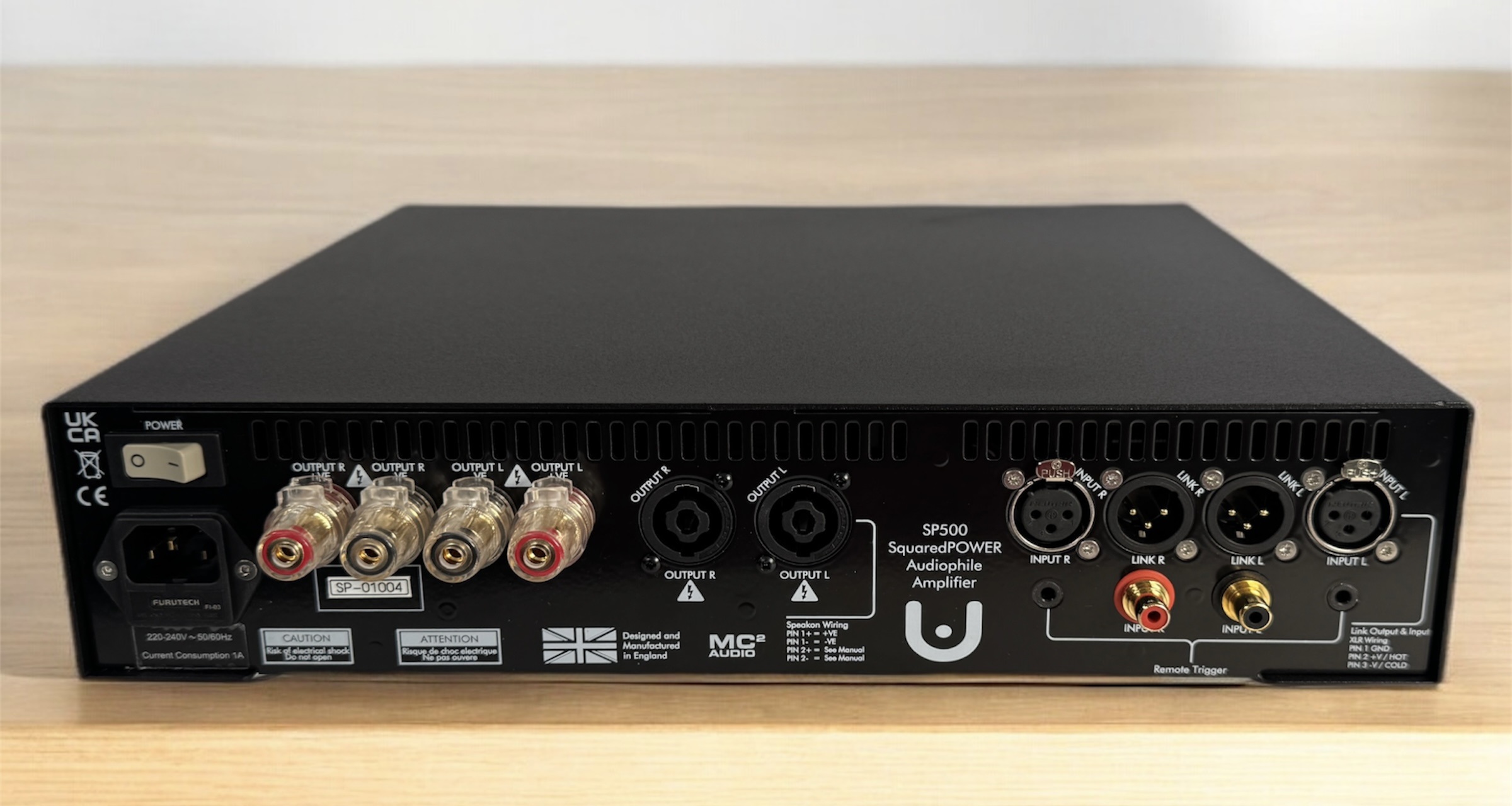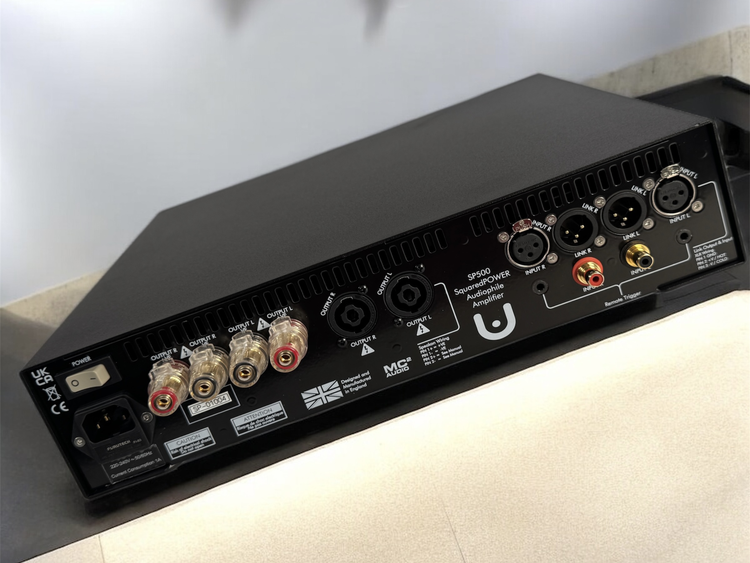 Ultrafide claims a power output per channel of 250 watts into eight ohms and 500 watts into four ohms. It has a dynamic range of 115 dB and a frequency response of 5 Hz to 20 kHz (+/- 0.3 dB). The output impedance is 0.025 ohms. Dimensions are 382 x 325 x 97 millimeters, and the SP500 weighs just over 13 kilograms.