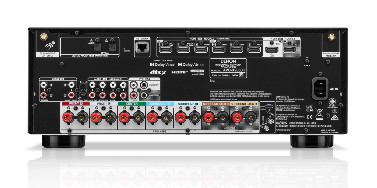 The Denon AVC-X2850 has a total of six HDMI inputs, three of which are designed for 8K signals. There are also two HDMI outputs, one of which supports eARC. For gamers, features such as VRR (Variable Refresh Rate), ALLM (Auto Low Latency Mode) and QFT (Quick Frame Transport) are integrated for smooth, low-latency playback.