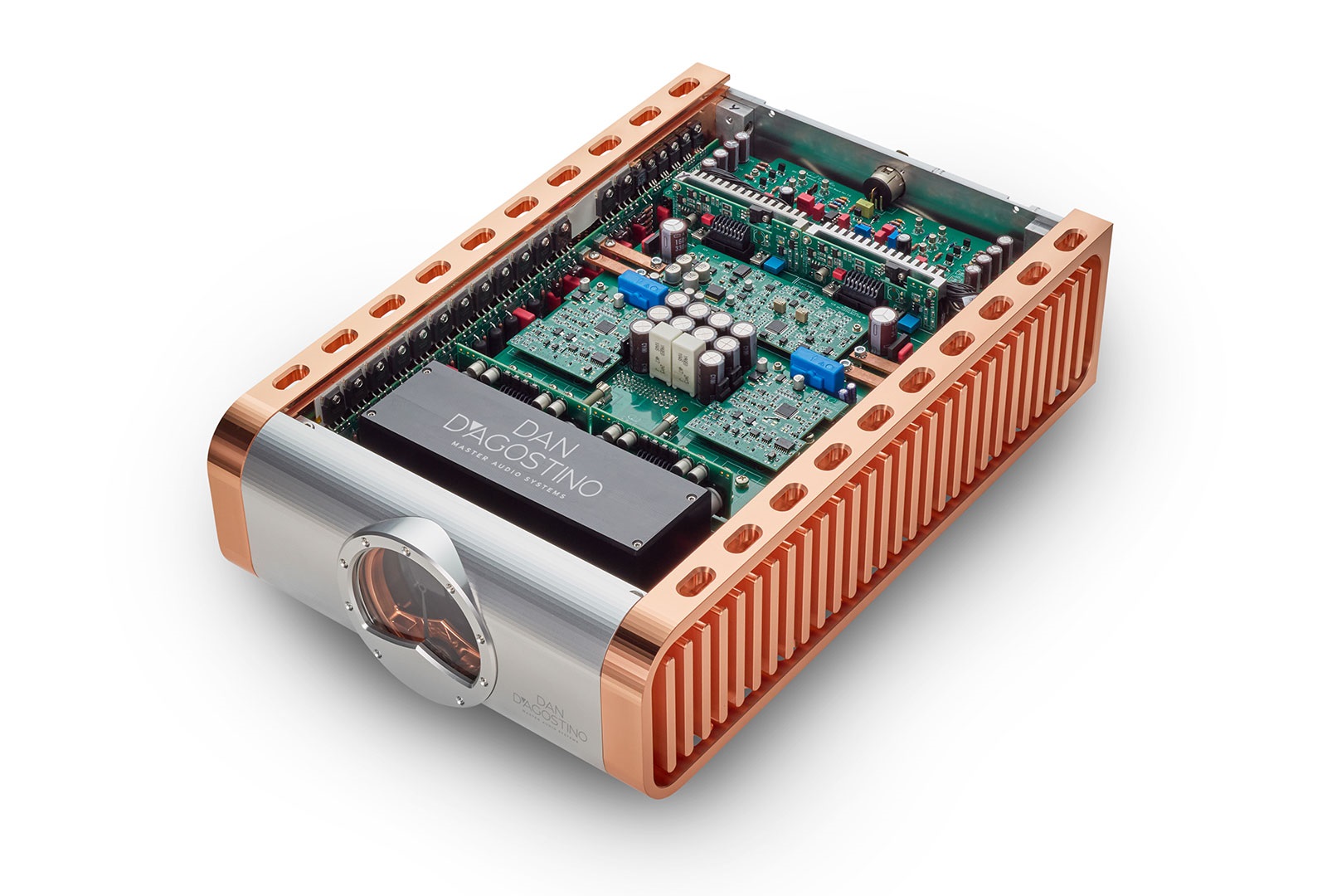 Visually, the Momentum Z is unmistakably a D'Agostino. Its signature copper heatsink fins are now five-axis milled from solid 19-kilogram blocks, creating an elliptical geometry designed to improve airflow and heat dissipation. Because copper has nearly twice the thermal conductivity of aluminum, this design contributes to stability, even when the amplifier is delivering its full multi-kilowatt output.