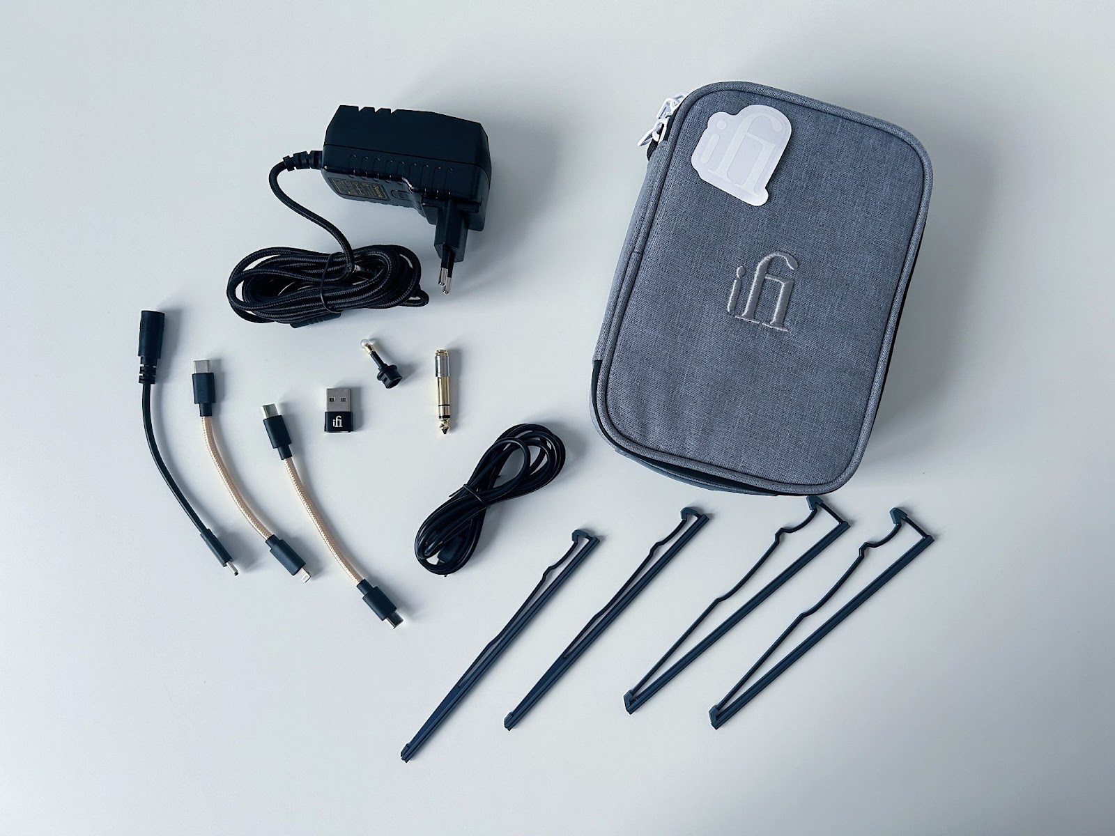 The unboxing of the iFi iDSD Diablo 2 is an experience in itself, presented in a sizable and hefty package that elaborately lists its specifications. Upon opening, you're greeted with a treasure trove of accessories that go above and beyond: the iTraveller case, iPower2 power supply, a lengthy USB-C/USB-C cable, USB-C to USB-A adapter, TOSLINK optical adapter, a short USB-C/USB-C and USB-C to Lightning cable, a 3.5mm to 6.3mm plug adapter, two stands, and two stickers. iFi's knack for lavish packaging is evident, ensuring that users have everything they need for any listening situation straight out of the box.