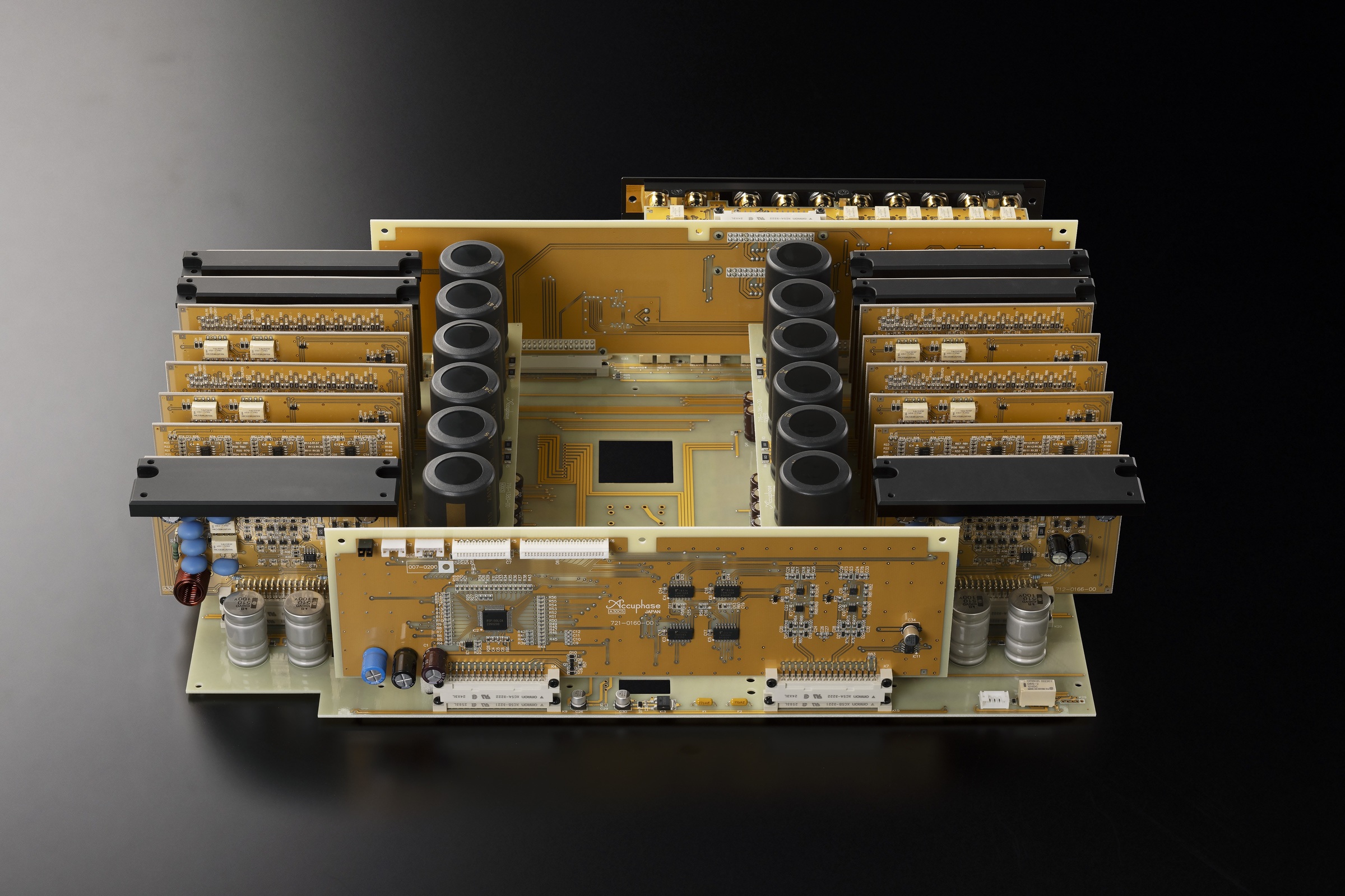 The power supply is consistently designed as a dual-mono system. Separate power supplies for the left and right channels, based on toroidal transformers, as well as a total of twelve filter capacitors, each with a capacitance of 10,000 µF, ensure stable power supply. Signal transmission takes place via printed circuit boards made of fiberglass-reinforced plastic (FRP) with fluorocarbon resin, which features a low dielectric constant.