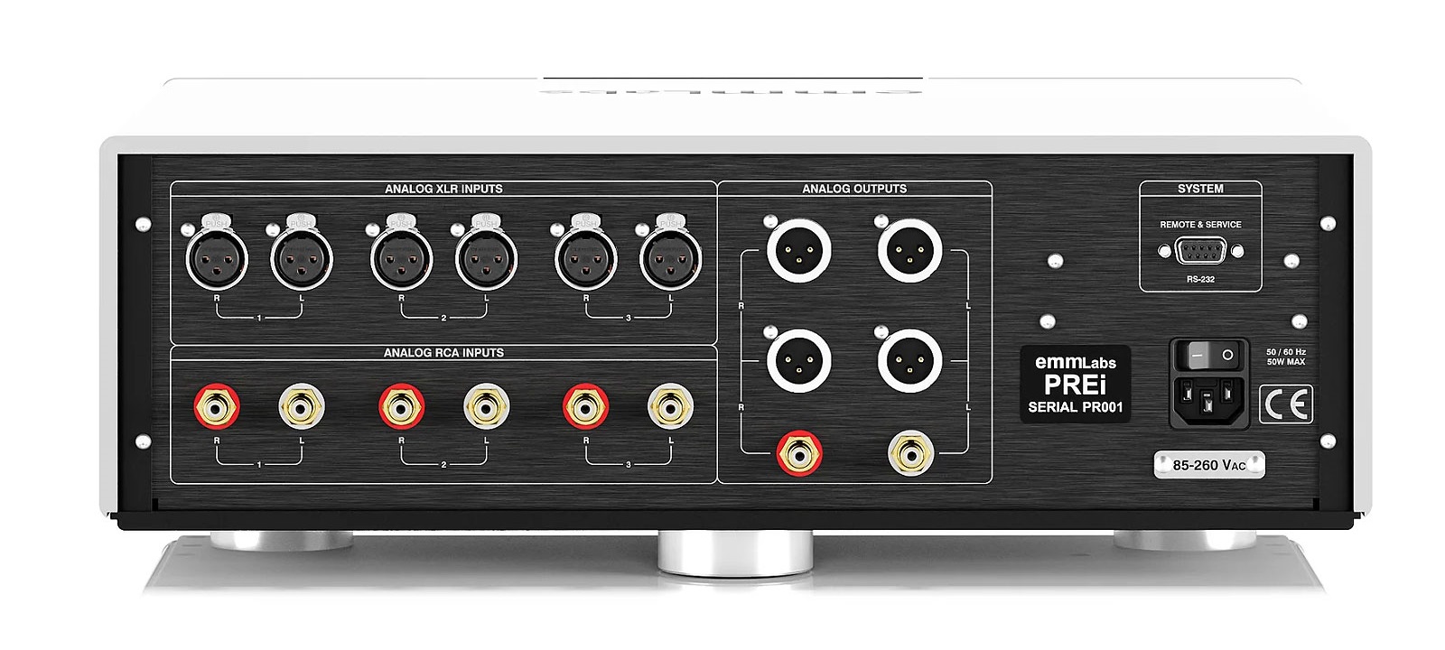 The EMM Labs PREi is fully double-balanced and built around discrete Class A amplification stages. EMM Labs states that integrated operational amplifiers (op amps) are not used anywhere in the signal path. The company's Meitner Audio Architecture (MAA) forms the backbone of the design, with all analog stages developed and built in-house instead of using third-party modules.