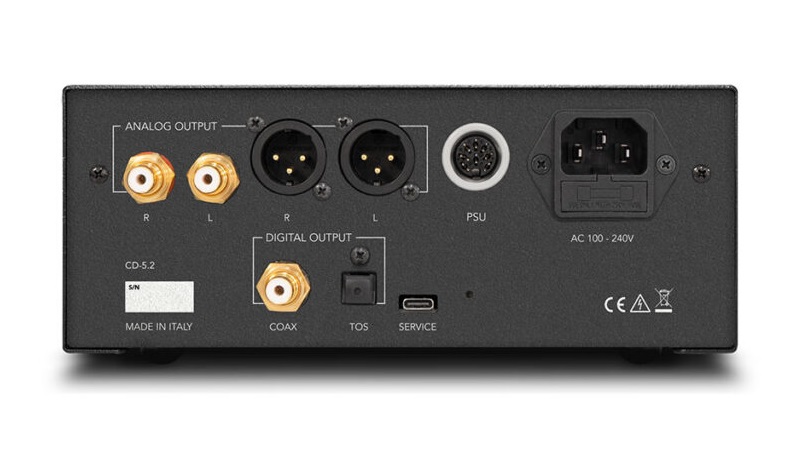 Analog music signals are output via RCA and XLR, and digital outputs are also included. According to the manufacturer, the internal power supply has been improved, but the CD-5.2 can also be powered by the optional external power supply.