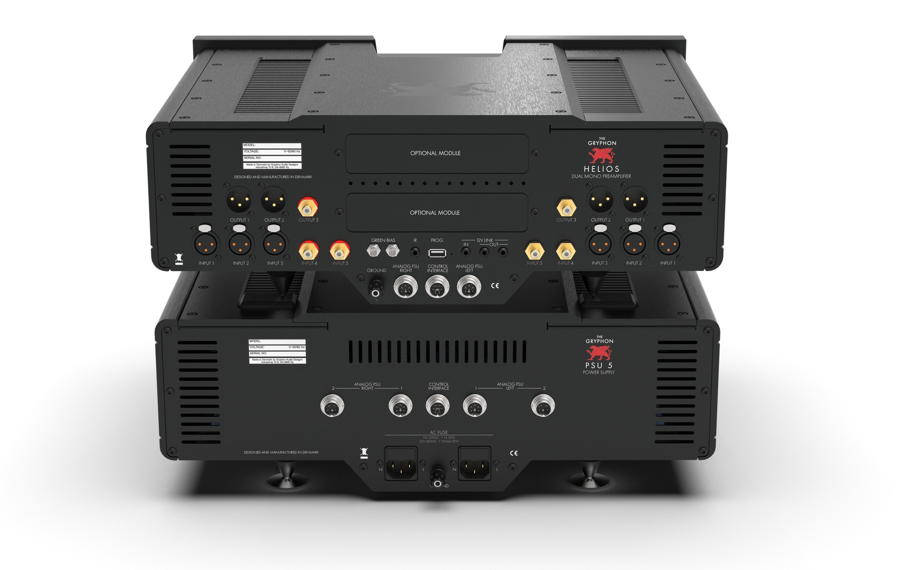 For ultimate versatility, the Gryphon Helios is compatible with the latest digital and analog modules. Two cover panels on the rear of the preamplifier housing allow the Helios to be expanded with the DAC3 digital module and/or the PS3 phono module, either at the time of purchase or at a later date, at the user's discretion. This ability to adapt system interfaces and functionality to diverse applications distinguishes the Helios from all other ultra-luxury preamplifiers.