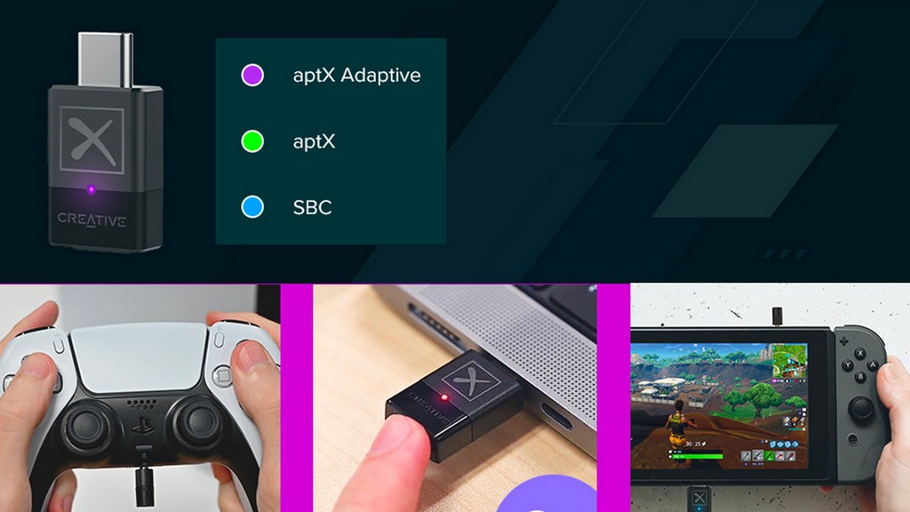 When using aptX Adaptive, the adapter light turns purple. When the color is green, it means the base aptX codec is being used. Bluetooth SBC is indicated in blue. BT-W4 can switch between four devices at the touch of a button. The kit includes a plug-in microphone that is convenient for use with game consoles to support Hands-Free Profile voice chat. The Creative BT-W4 adapter is compatible with PC, Mac, Nintendo Switch, PS4 and PS5.
