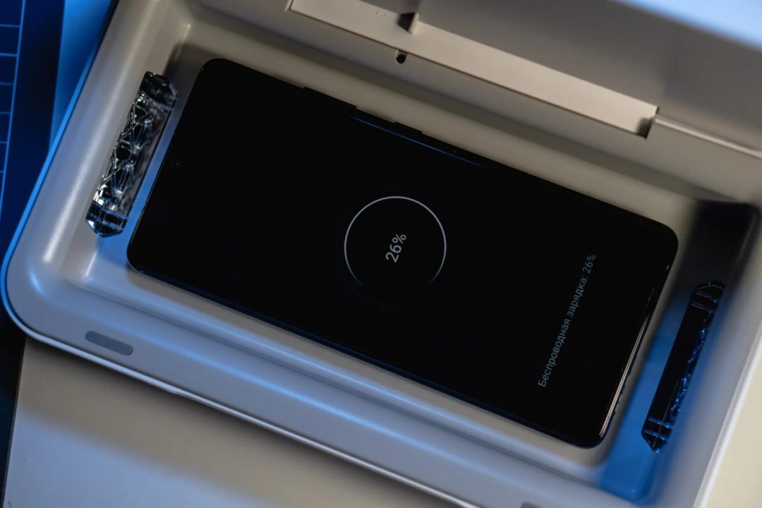 According to Samsung, the sterilizer kills up to 99% of bacteria, and I want to believe in it. Moreover, the figures were confirmed by a number of independent experts – for example, the British Intertek Group plc and the Swiss SGS SA. However, the GP-TOU020SABWR is interesting not only for the ability to handle items, but also for the presence of wireless charging of the Qi standard. Thus, it can be used to replenish energy on devices that support it. The maximum power is 10 W, which is quite enough for comfortable use. There is a lot of space inside, devices with dimensions up to 196 × 96 × 33 mm should fit.