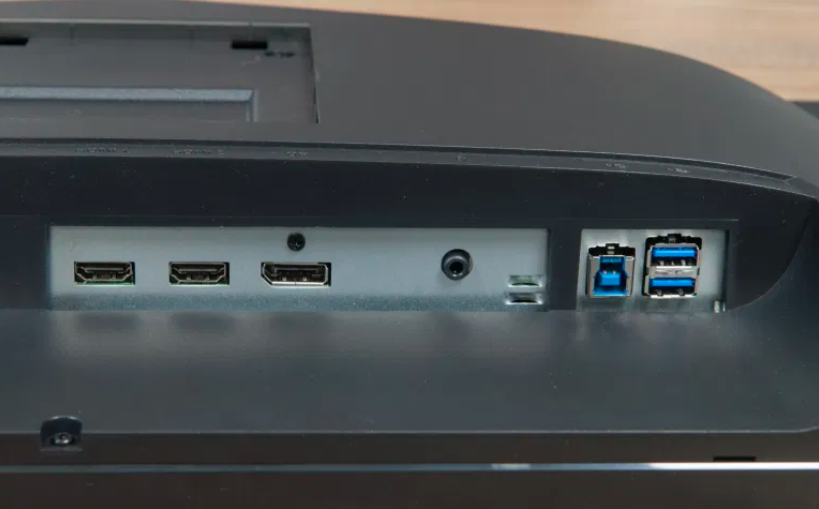 All connectors are located in a niche under the foot mount and are oriented downward; here you can find two HDMI 2.0 ports, one DisplayPort 1.2a, a mini-jack for connecting a headset and a USB hub with 2 USB 3.0 ports; 2 more of the same ports are placed on the side of the monitor.