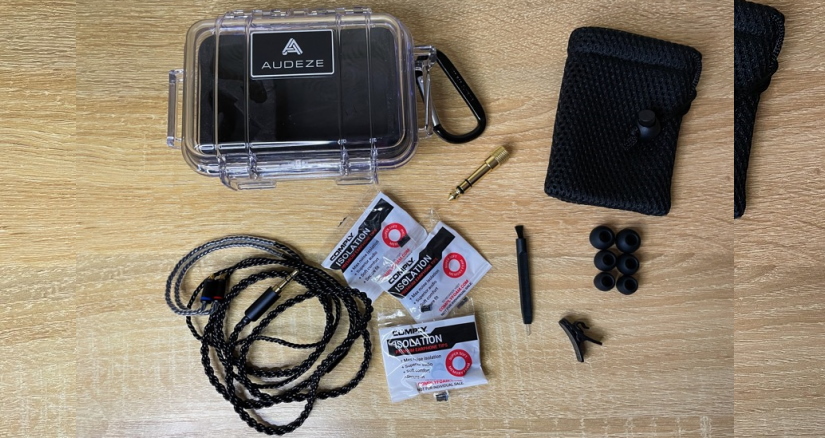 We are greeted by a discreet glossy black box with a geometric pattern of the letters “A”. The package for my Audeze Euclid sample was not record-breakingly generous, but acceptable: 3 pairs of regular silicone tips, 3 pairs of Comply foams, a Pelican 1010 case, a cloth bag, a cleaning tool, an adapter for a 6.3 mm jack and a clothespin. Of course, after the scattering of ear pads that some Chinese Hi-Fi brands, such as FiiO and iBasso, usually put on their headphones, such a set of accessories is perceived as more modest, but everything you need for the first time is here.