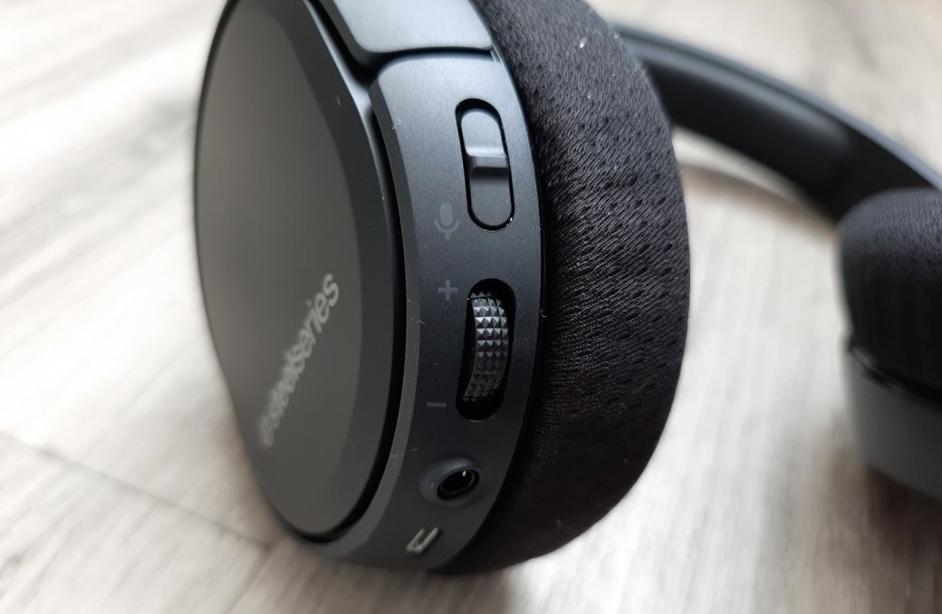 The left cup of Steelseries Arctis 1 Wireless is occupied by an analog volume wheel, a microphone activation button and a connector for its connection, a micro-USB input for charging and a 3.5 mm audio jack. All elements are in convenient places, easy to recognize and turn on. The main question for the model at this stage is why, when using USB C in the wireless connector, did they leave the old microUSB for charging the headphones themselves? Why waste time on trifles and not put USB Type-C in both places?