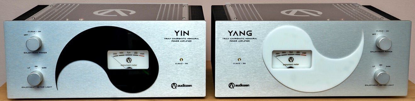 Audiozen has decided to please us with the monophonic amplifiers Yin and Yang (Yin and Yang). This “amplifying pair” is distinguished not only by the idea of an inseparable whole, but also by rather unusual wattmeters, which are presented here as “Enjoyment meters” with gradations “Zen”, “Sex”, “Fun”, “Gig” and “Max”.