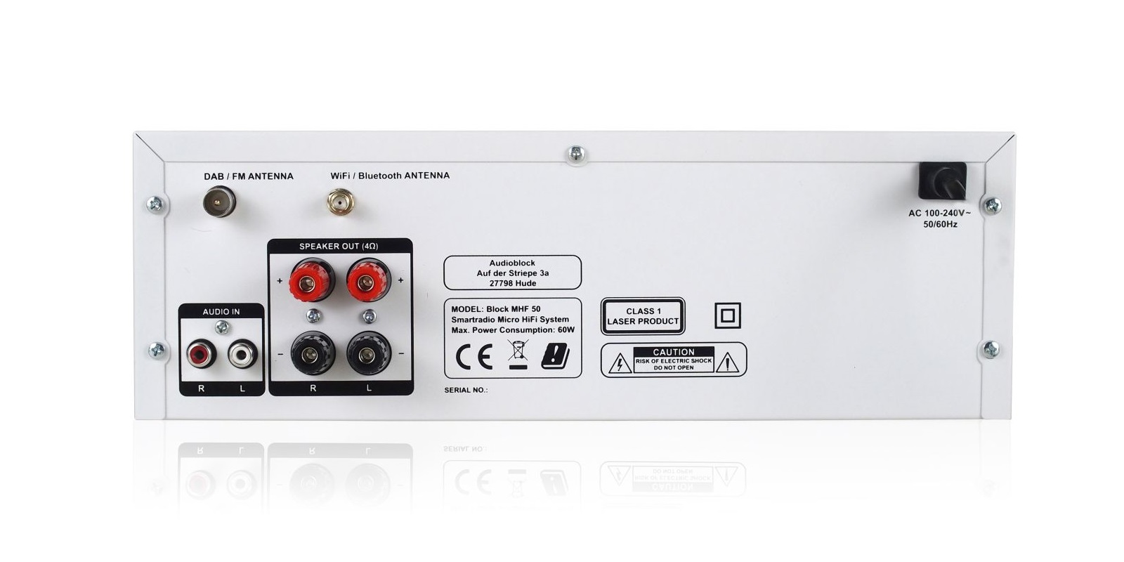 Wireless network connectivity is available exclusively through WiFi. The MHP5 functions as a DLNA/UPnP streaming client, which can be managed using the Oktov app. Spotify can also be accessed via Spotify Connect. Furthermore, Bluetooth connectivity is included. On the rear, there is a stereo cinch line input with a sensitivity of 450 mVolt.