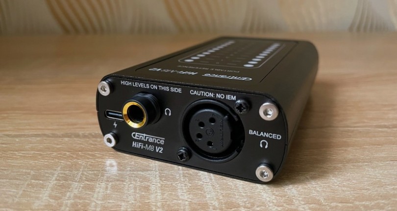 Let’s briefly go through the characteristics. CEntrance HiFi-M8 V2 has 2 inputs (USB-C and Bluetooth 5.0 with AAC and aptX) and 4 outputs (2 balanced 2.5 and Neutrik XLR, 2 regular 3.5 and 6.3). An interesting fact: you can connect four pairs of headphones to the model at the same time, and they will play. On the body of the device, the manufacturer has designated two sides, “cold” and “hot”. Accordingly, one of them gives less power, there are 2.5 and 3.5 connectors, and the second is more powerful, there are 6.3 and balanced XLR outputs. But, in practice, the 6.3 connector does not show miracles, I do not advise counting on it with really demanding headphones, choose XLR. I also have a purely aesthetic question, why did 6.3 come out ahead, although this, of course, is a trifle.