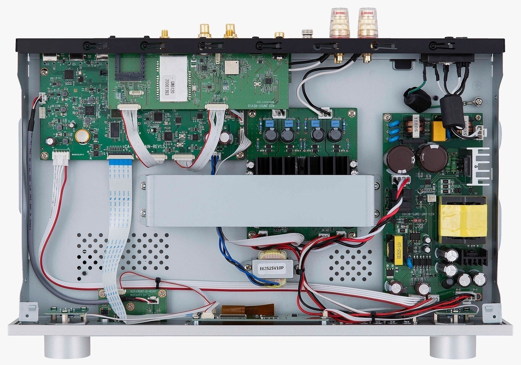 If we talk about audio formats, then the list includes: DSD (64/128/256), MQA, DXD (24 bit / 352.8 kHz), PCM up to 32 bit / 384 kHz, including 24 bit / 192 kHz – this is FLAC, WAV, CAF, ALAC, AIFF and others. The N25AMP carries a proprietary multi-room functionality, there is an HDMI eARC input on board for a harmonious connection to a TV.