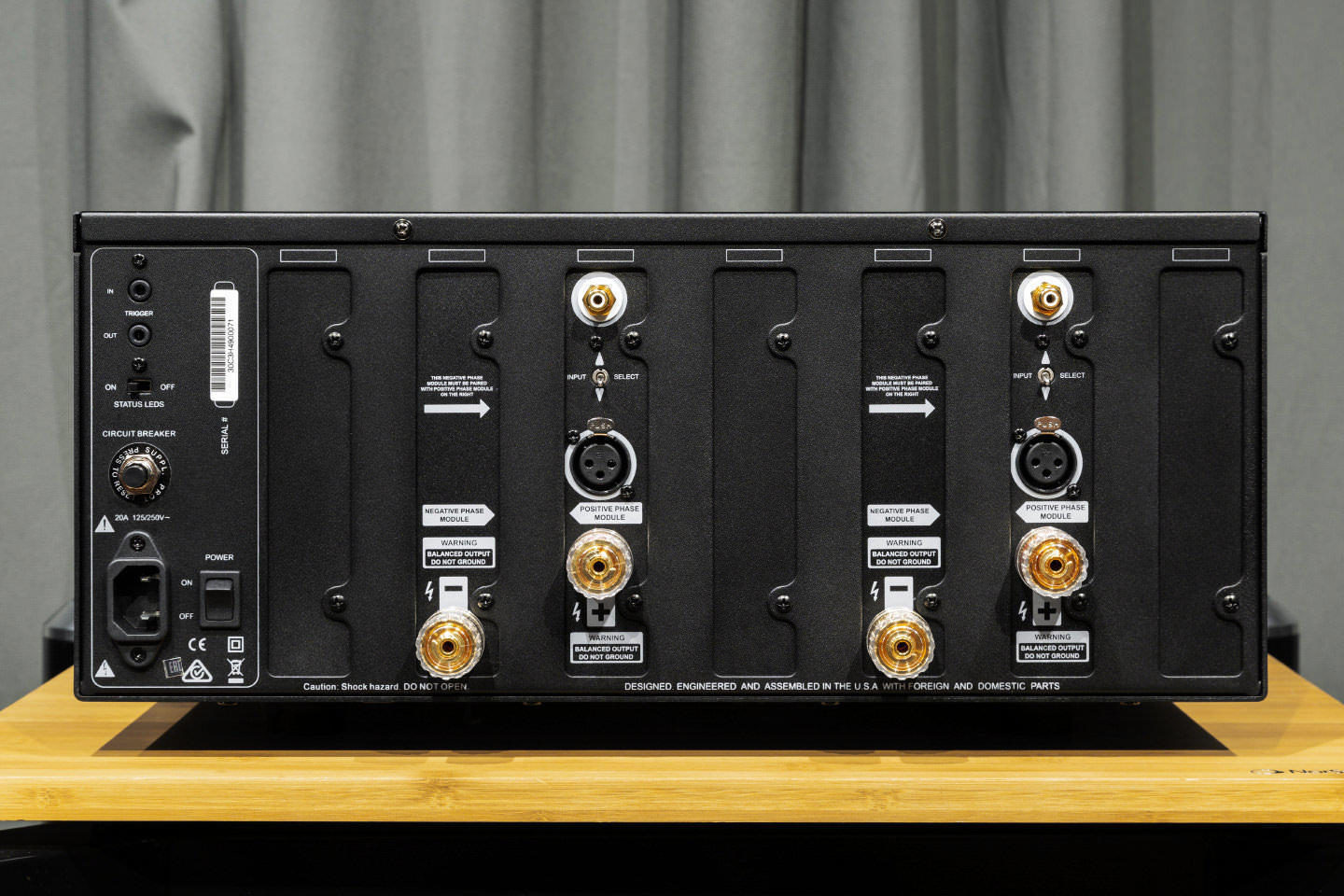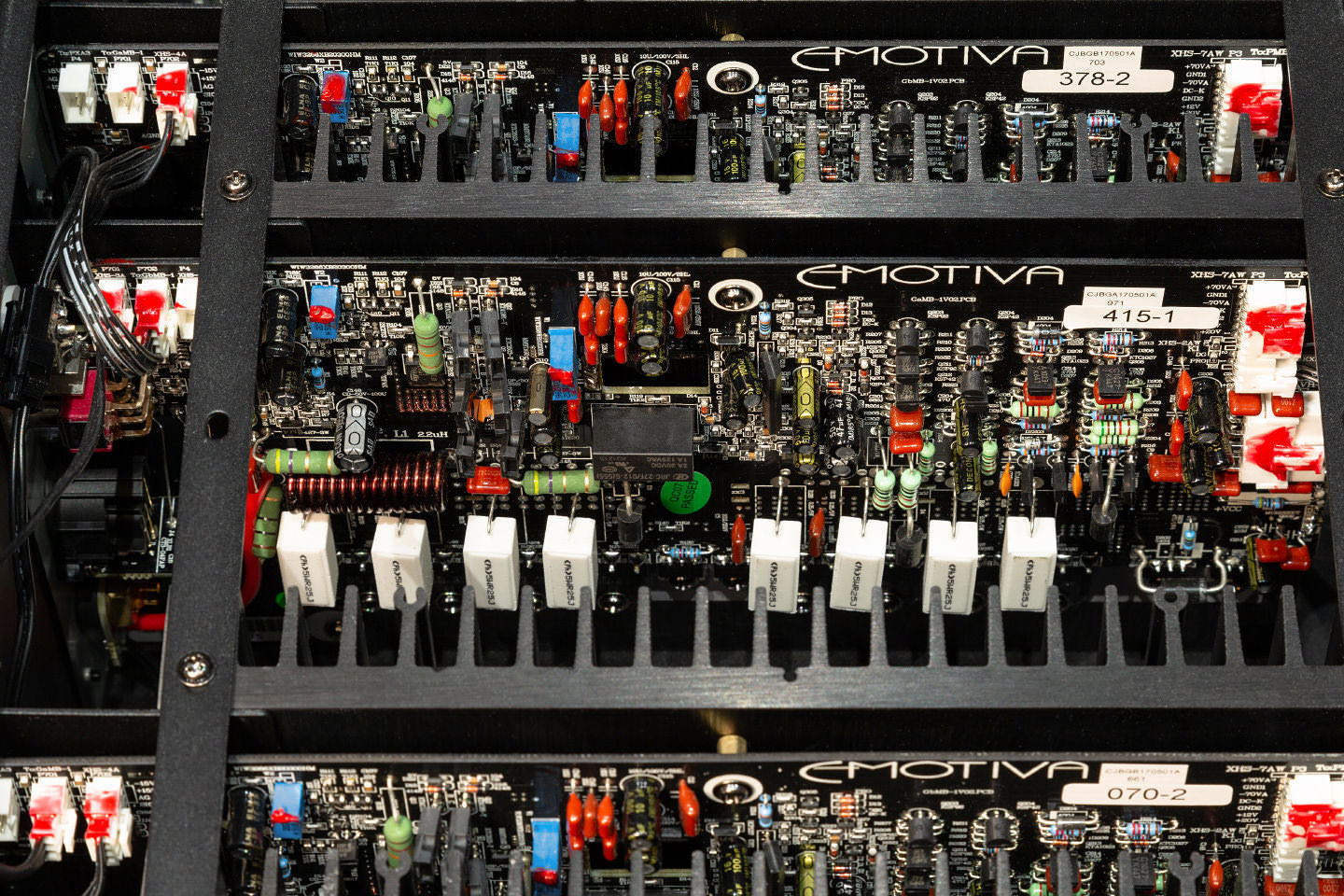 These modules have a fully differential, or in more familiar language – balanced circuitry. That is why each module occupies two slots in the housing, and the output terminals are arranged in an unusual way – one per slot. The advantages of differential circuitry are well known: reduced distortion, noise immunity, high power. In contrast to simpler solutions, when the signal ceases to be symmetrical already in the input stage of the power amplifier, the Emotiva XPA-DR2 retains the principle of signal symmetry throughout the entire length of the sound path.