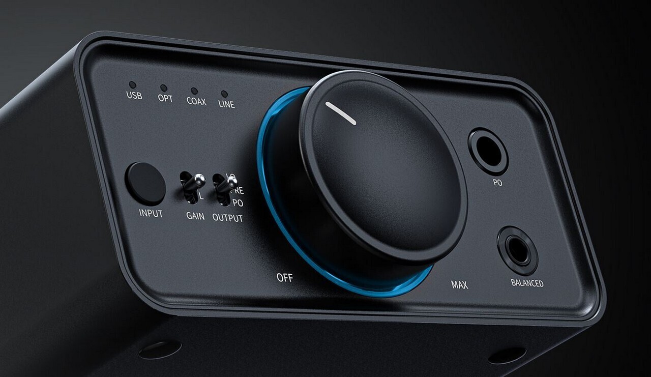 Almost the entire width of the front panel is occupied by a large encoder that controls the volume using the NJU72315 chip and a buffer amplifier. The design is complemented by RGB color indication – mode switching looks bright in its own way.