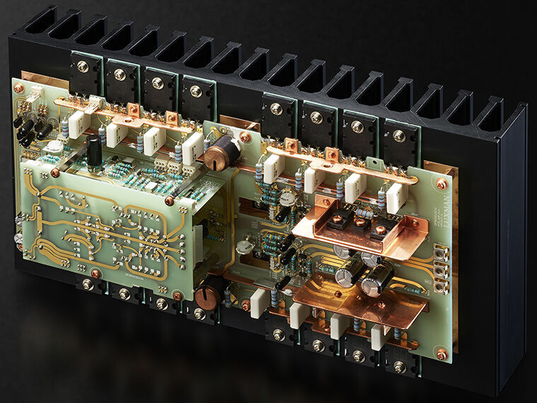 The M-10x has 4-channel push-pull output modules equipped with 3-stage composite Darlington transistors. The result was a 4-parallel push-pull output stage with 16 transistors per channel.