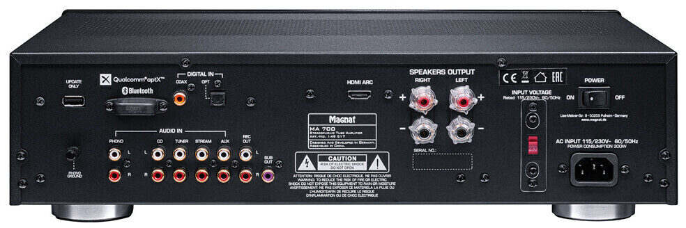 The MA 700 preamplifier is based on the “prepared” ECC 81 dual triode – according to Magnat, it won’t need to be replaced soon. The solid-state power supply is class AB and can deliver 70 watts per channel at an impedance of 4 ohms. The company also emphasized the presence of a special toroidal transformer in the power supply and circuit separation technology for more stable, clean operation of the device.