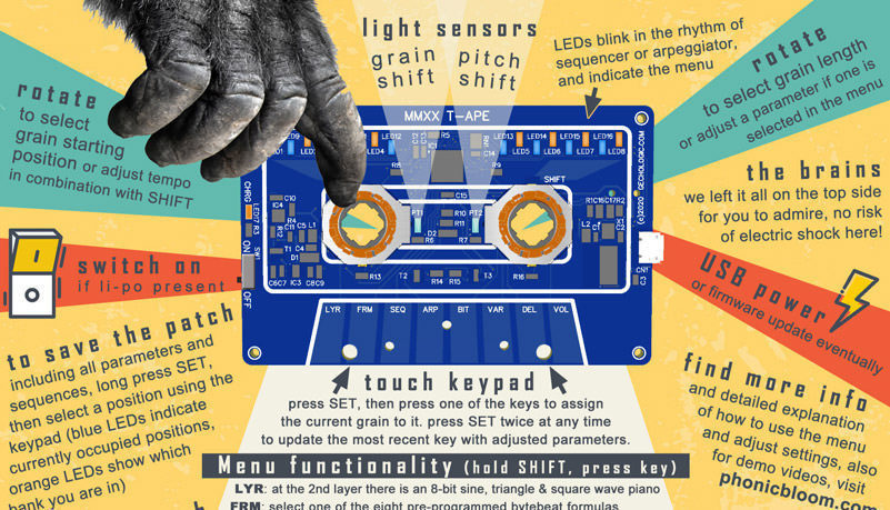 The device is based on bytebeat technologies that turn program code into sound. The main functionality of the Mmxx T-Ape is to “edit” the code using various switches, rotary controls, buttons and sensors. We are talking not only about tactile sensors, but also about light ones: the sound signal can be changed by removing or adding illumination (for example, with the palm of your hand). This function can be compared to the theremin.