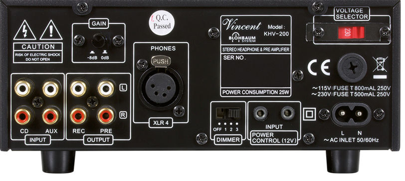 KHV-200 is equipped with outputs: 1 x stereo RCA (PRE OUT), 1 x stereo RCA (REC OUT), 1 x stereo headphone jack 6, 3 mm, 1 x Headphene XLR, 4-pin stereo. The built-in power supply unit operates with voltages of 230 V / 50 Hz or 115 V / 50/60 Hz. The body of the amplifier can be black or silver.