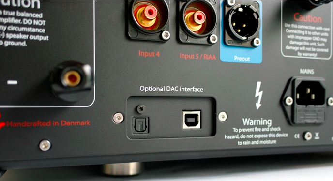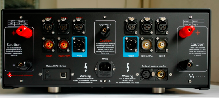 There are also two XLR pre outputs for possible amplifier or subwoofer connection. The RIAA mark on input 5 and the ground in the center of the rear indicate a large wild booster, capable of accepting up to two modules for phono stgae, DAC and headphone amplifier.