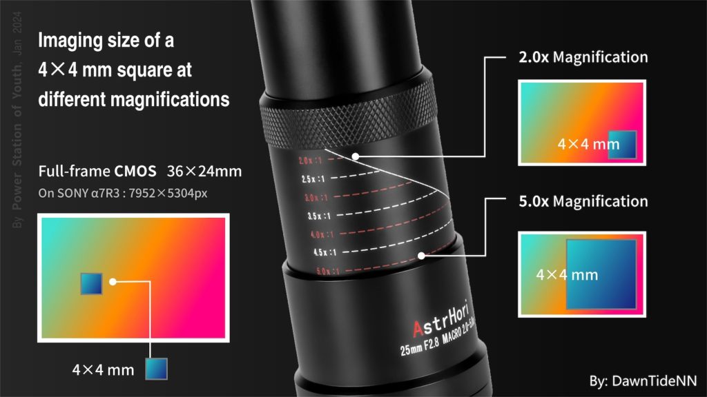 The cost of the lens is $249. The company provides an illustration demonstrating the macro capabilities of the new AstrHori 25mm F/2.8 2x-5x lens: