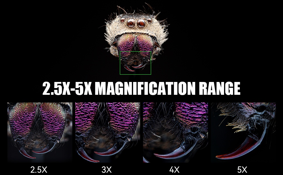Different magnification ratios are supported: 2x-5x. In the first case, the viewing angle will be 20°, and in the second – 9°. The minimum focusing distance is: 2X (113 mm), 3X (137.8 mm), 4X (162 mm), 5X (186.4 mm).