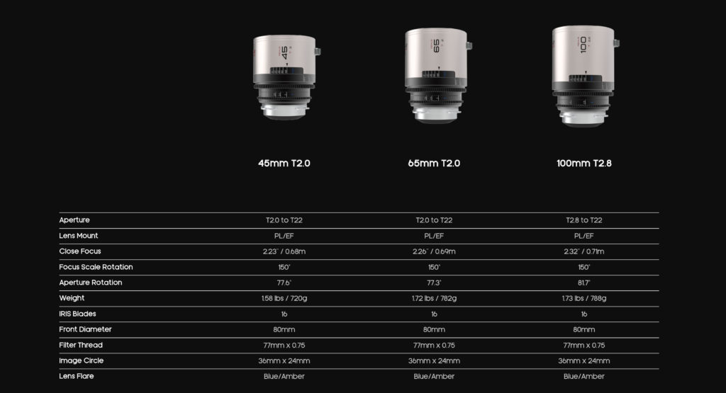 The Chinese company Blazar (previously called Great Joy and also produced cinema optics) has released a new set of anamorphic cinema lenses with a compression ratio of 1.5x – the Remus line. Currently the series includes three lenses with focal lengths of 45, 65 and 100mm. At the same time, the optics turned out to be quite compact and light – the weight of the lenses does not exceed 800 grams. Thus, the lenses are designed for both full-fledged cinema cameras and mirrorless cameras with advanced video capabilities.