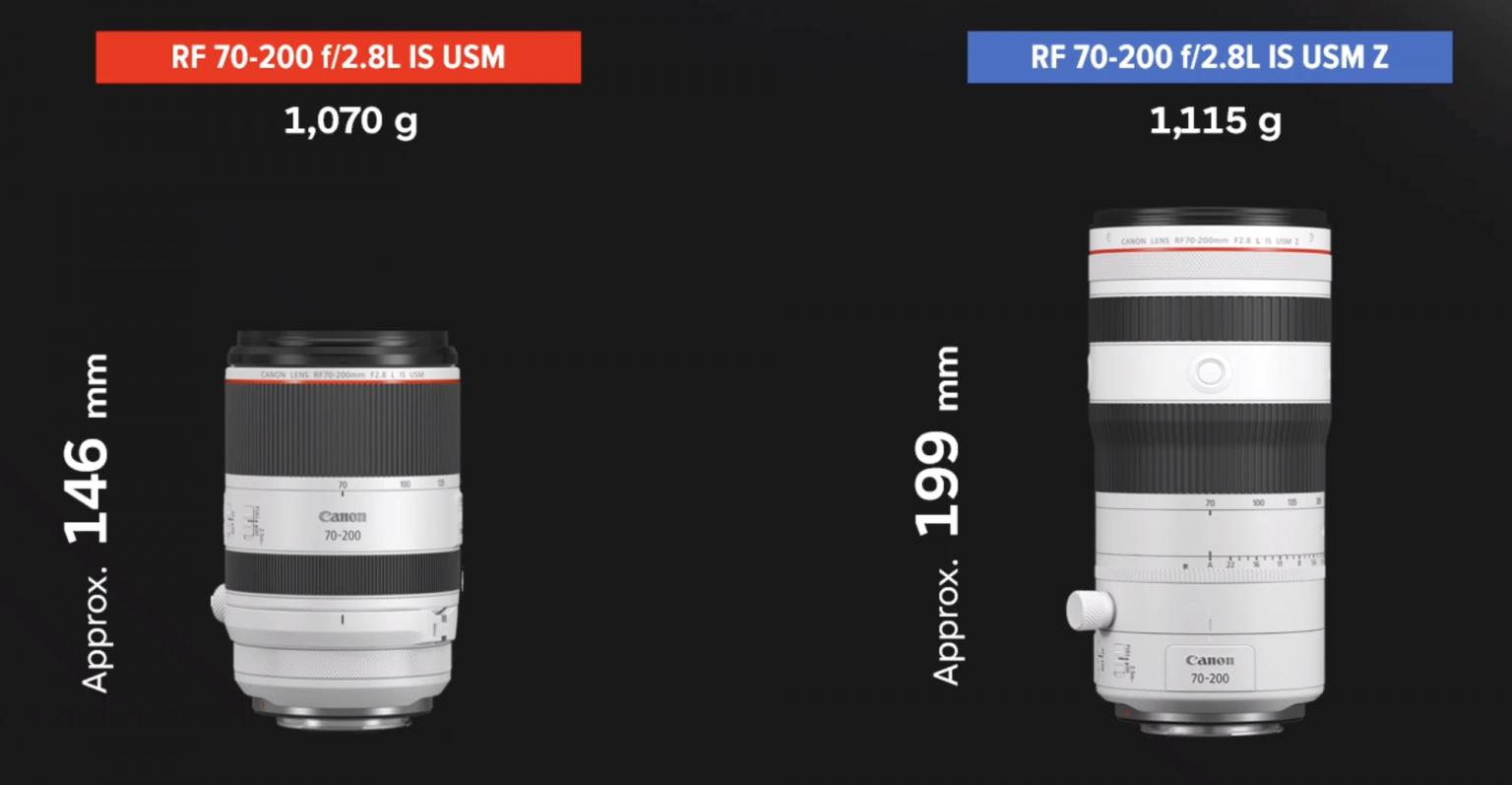 The new Canon RF 70-200mm F/2.8L IS USM Z is longer than the Canon RF 70-200mm F/2.8 L IS USM (however, the photo lens does not have an internal zoom, so it extends when changing the focal length), but is only slightly heavier at 1100 grams. The front filter diameter is 82 mm. In a direct comparison, the two lenses look like this: