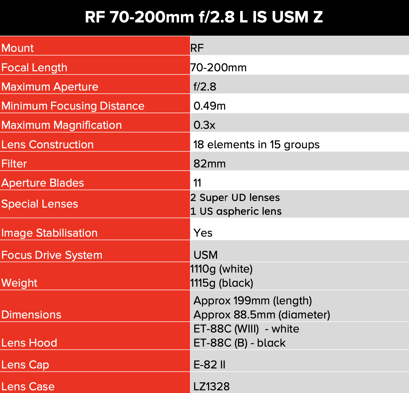 The optical design of the new Canon RF 70-200mm F/2.8L IS USM Z lens consists of 18 elements in 15 groups and has an 11-bladed aperture . This differs from the Canon RF 70-200mm F/2.8 L IS USM lens, which has 17 elements in 13 groups.