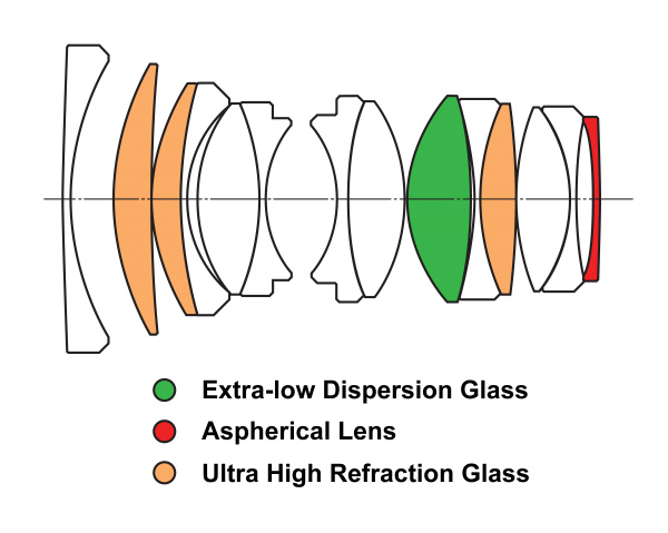 The lens design consists of 14 elements in 9 groups and includes one extra-low dispersion lens, one aspherical lens and three ultra-high refractive index to effectively suppress both lateral and longitudinal chromatic aberration at all apertures. The company promises excellent sharpness from the center to the edges.