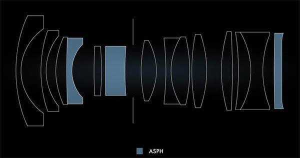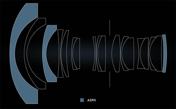 Ultra-wide-angle lens for full-frame cameras. Its optical design consists of 14 elements in 11 groups, and it can focus from a distance of 21 cm with a zoom ratio of 1:5.3.