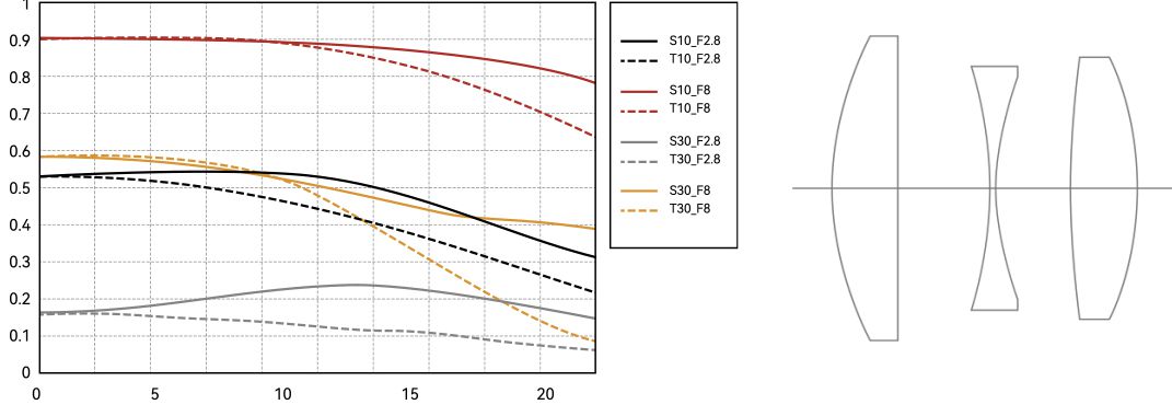 A full frame lens has a simple optical design with just three elements. The company also does not mention the use of any special elements that would likely interfere with the effect of “bubbles” in out-of-focus areas. The aperture range is from f/2.8 to f/22. The thread diameter for the filter is 49 mm.