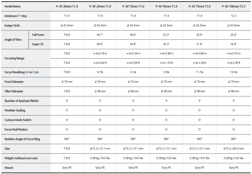 A complete table with the characteristics of all lenses in the Samyang V-AF line is below: