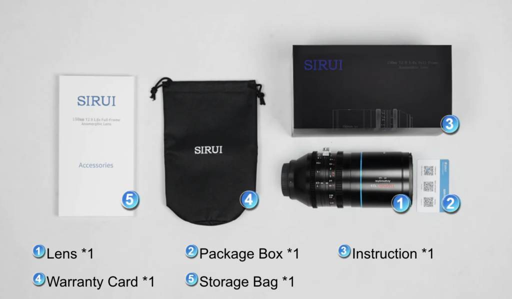 Optical pickup of the new Sirui Venus 150mm T2.9 1.6x anamorphic lens consists of 16 elements in 11 groups and supports only manual control. It is the only one in the entire series that has a 16-bladed aperture, the focus ring rotation angle is 153 degrees. The scope of delivery of the lens is as follows: