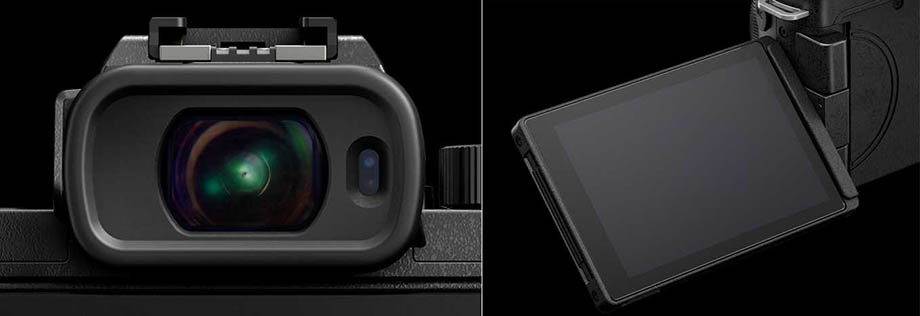 OLED viewfinder with approximately 2.36 million dot resolution, 0.74x magnification, nearly 100% field of view and virtually no time lag. The rotating 3-inch touchscreen LCD monitor with a resolution of 1.8 million dots is convenient for shooting any scene, including selfies.