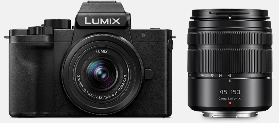 The DC-G100DW kit includes two lenses: LUMIX G VARIO 12-32mm F3.5-5.6 and 45-150mm F4.0-5.6