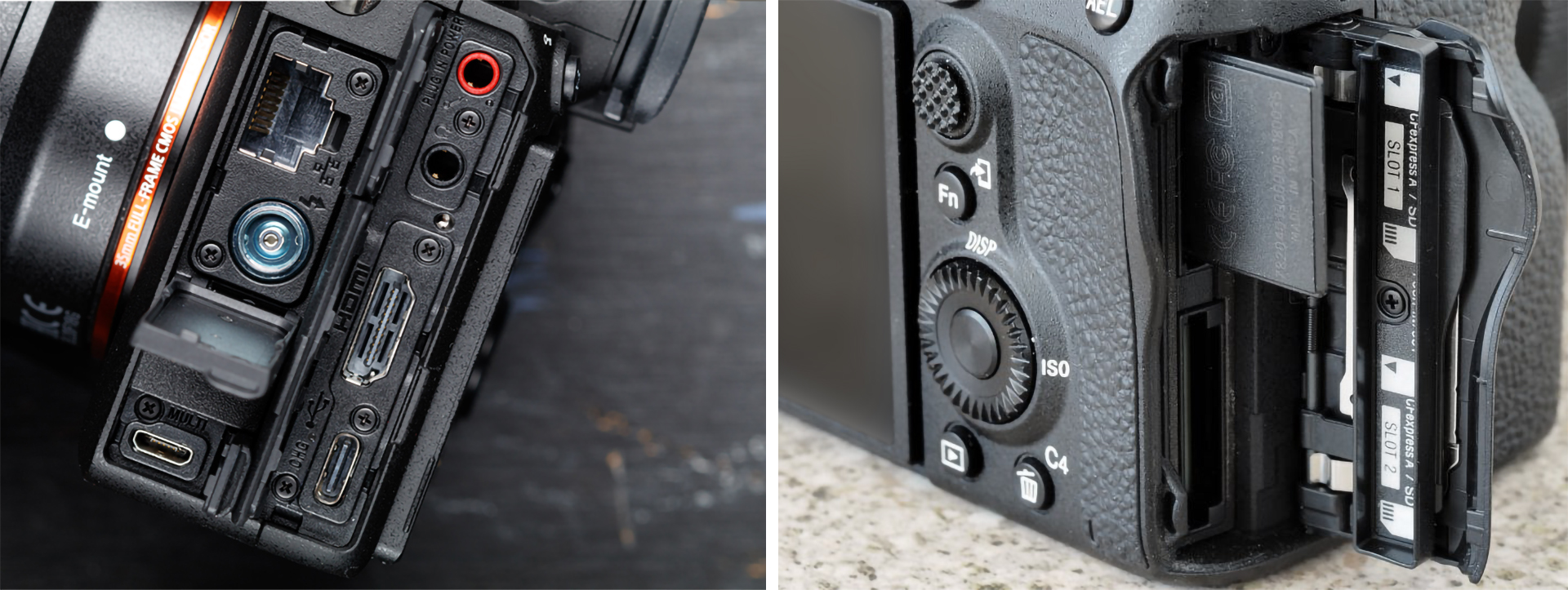 Like the A9 II, there is a PC sync port for outdoor lighting, now with faster sync speeds, and a wired Gigabit Ethernet port. In fact, with Wi-Fi 2.4 and 5 GHz, the Alpha 1 now supports FTP over wired or wireless LANs, and compatible USB and Bluetooth phones. There is a microphone input and a headphone output.