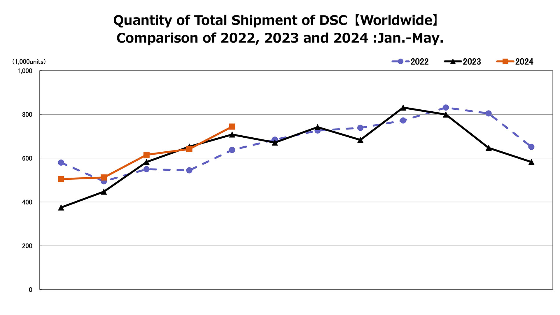 In May 2024, 743,000 cameras were sold (all cameras except cinema cameras) according to the CIPA report. In the same month of 2023, this figure was 707,000 units, and in 2022, it was 637,000 cameras.