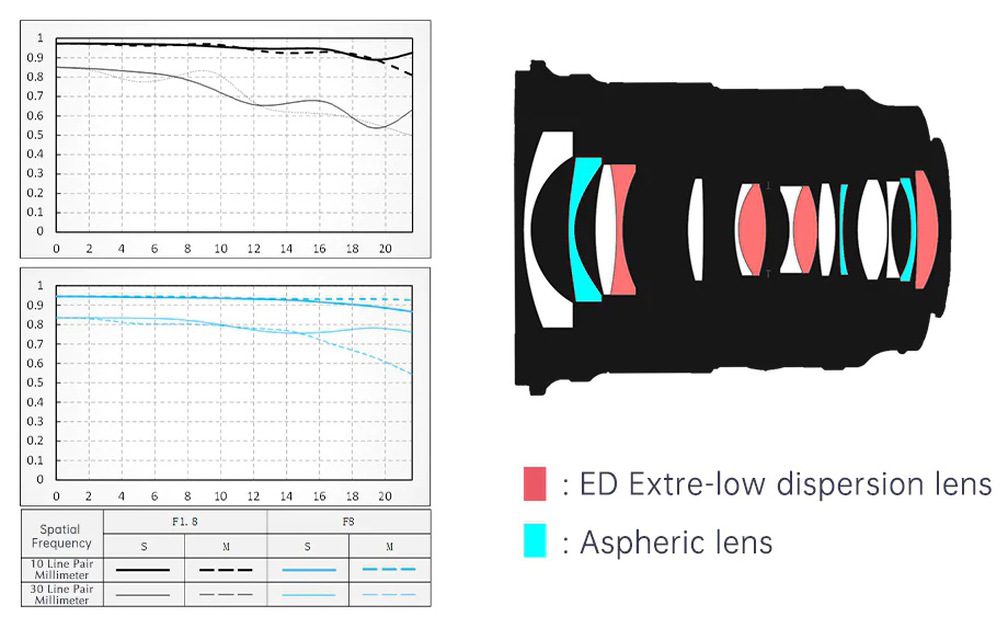 - Optical design with 15 elements in 12 groups, including 4 ED glass lenses and 3 aspherical lenses