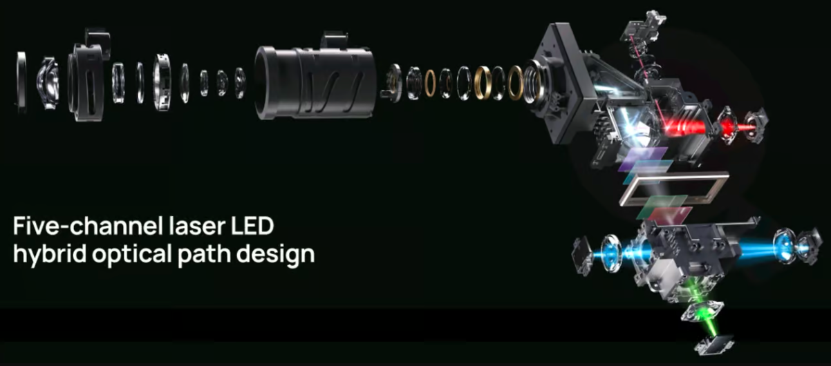 At XGIMI, both diodes and lasers are used without phosphors and phosphors – they shine directly, and their light is summed using a special optical system. In total, this module has three LEDs (R, G and B) and two lasers – blue and red. And the relative alignment of the characteristics occurs due to the introduction of a special component in the optical system, developed with the participation of the petrochemical holding Zeon Group from Düsseldorf.