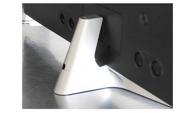 The same carefully designed is the frame (basel) of the TV, which is metallic and looks slightly small to the eye. In general, the TV is projected in the space as very thin and ethereal, although its weight is not small (30 kg with the base). The base of the TV is formed by two metal parts, which support it securely. We have seen its design in the past from other manufacturers.