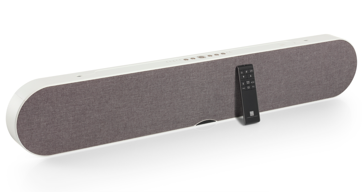 Its special design gives a new image to the genre, as it grows vertically and has a strongly rounded chassis at the edges, to fit more easily with TVs of different widths. It is produced in two finishes, Jet Black and Cream, with different tones in black / gray and white respectively and the grille of the front is covered with a beautiful cover, very different from the long and narrow “black boxes” that flood the market.