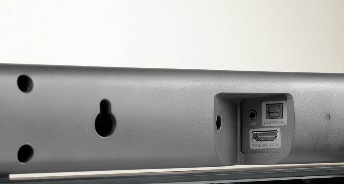 Another thing is surprising: the set, taken out of a container of modest size, is so weightless and laconic that at first it is perceived as a toy or even a dummy made on a smaller scale. In the characteristics – no information about the power of the amplifiers and the composition of the speakers. The main element, the soundbar itself, does not even reach a meter in length and is distinguished by a very thin body with a height of less than six centimeters. But if this component still has attributes that give out in it belonging to audio equipment (connectors on the rear panel, shiny recessed volume control and input selection buttons on the top surface, LED indicators on the front), then the subwoofer does not at all look like its counterparts – this is just a black parallelepiped with a round bass reflex hole in the front and a power cable socket in the back. No inputs, no settings, not even a power switch! All this economy, as it turns out, is replaced by the microscopic BAR SYNC button, which you need to use only once, when you plug both units into the outlets. This will send a command to the soundbar to establish a wireless connection with the bass machine, activate the power control channel and all the necessary settings for the low frequency band.