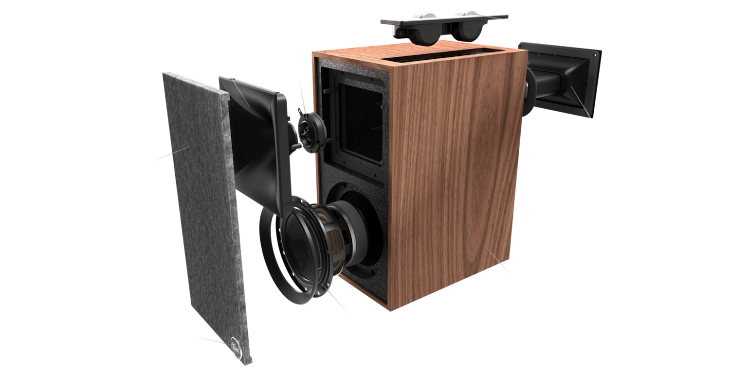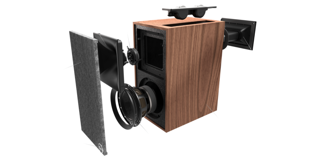 There are two color versions: walnut and black. We were visited by the first version, a beautiful edition that fits really nicely in a living room with a Scandinavian TV cabinet or retro sofa. Just like speakers of yore, the wood has been applied all around and there is a front with a rougher texture that is mounted slightly recessed. As a result, that black front panel is framed by wood, seen from the sofa, which is a classic look in hi-fi. Equally classic – especially for Klipsch – is the immense horn speaker that takes up half of the front, with a smaller woofer underneath. Take a quick look at these speakers and you will immediately believe that they are original devices from long ago. We suspect that many retro fans will get a kick out of that. For whom the view of all this seems just too busy (and we are honestly in that group) Klipsch has provided an alternative.