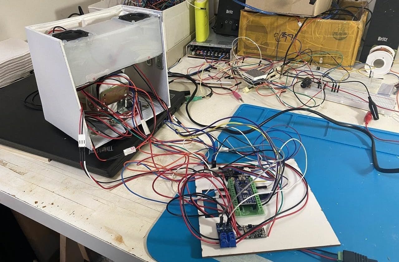 Several upward-facing speakers and a compact amplifier are responsible for the sound. The visualization system is based on the Arduino Nano electronic platform.