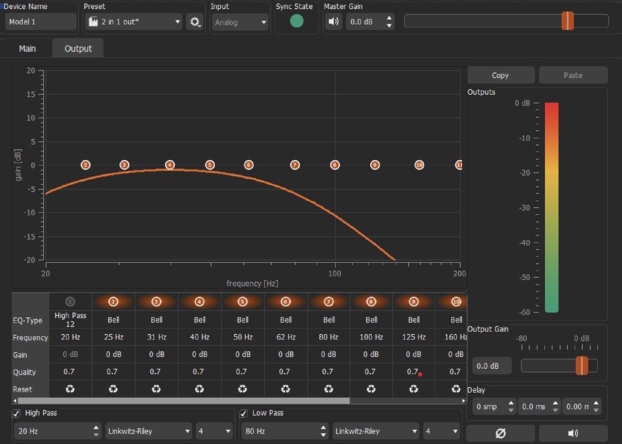 In order not to confuse the new model with the old one, you need to go to the rear of the subwoofer: two XLR connectors are located not horizontally, but vertically, and next to the inputs there is a color touch display, with which you can quickly change DSP presets without connecting the subwoofer to the computer. Through this screen you can also activate useful functions: automatic switching on and off based on the presence or loss of an input signal, eliminating clipping, temperature control.