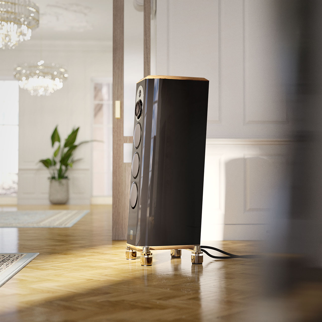 The standard shaped cabinet houses a 2cm diamond tweeter, 13cm ceramic midrange and 18cm woofer with honeycomb aluminum sandwich cones. All five speakers are installed using Cell technology . This means that the centers of all emitters are located in the same plane. In this way, absolute coherence of the drivers is achieved.