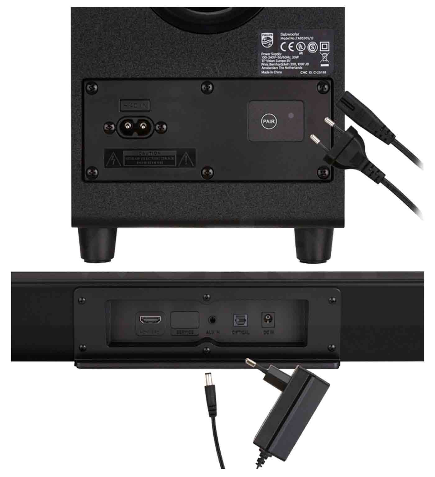 It is worth clarifying right away that the Philips TAB5305 soundbar does not come with any cable (HDMI, Aux or optical) that could be used to connect the bar to the TV. Everything in the Philips TAB5305 soundbar packaging is the TAB5305 soundbar and subwoofer, a remote control with batteries, a power adapter, a 220 volt subwoofer cord and brackets for wall mounting.